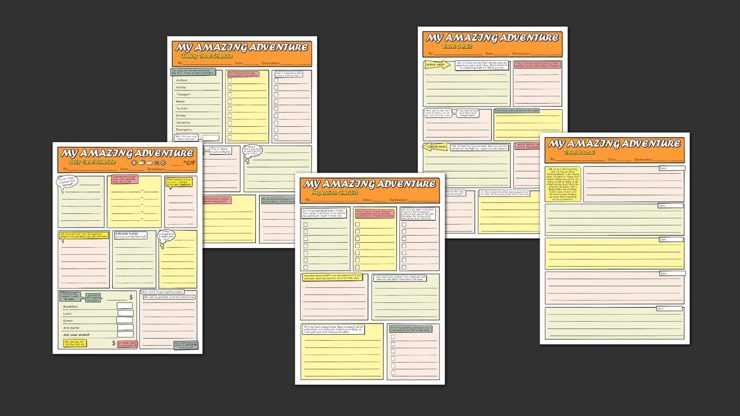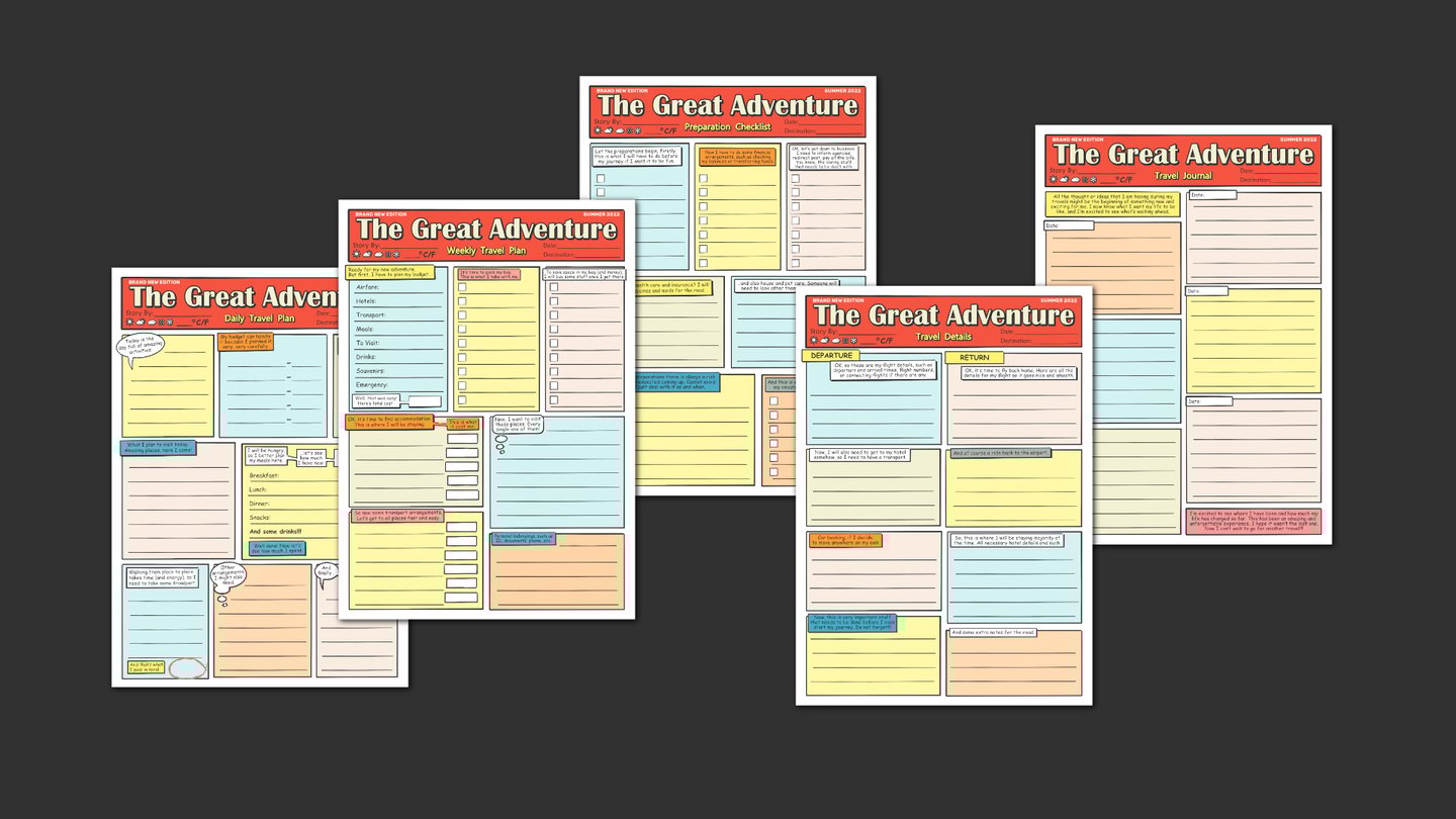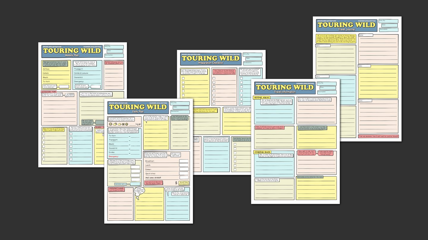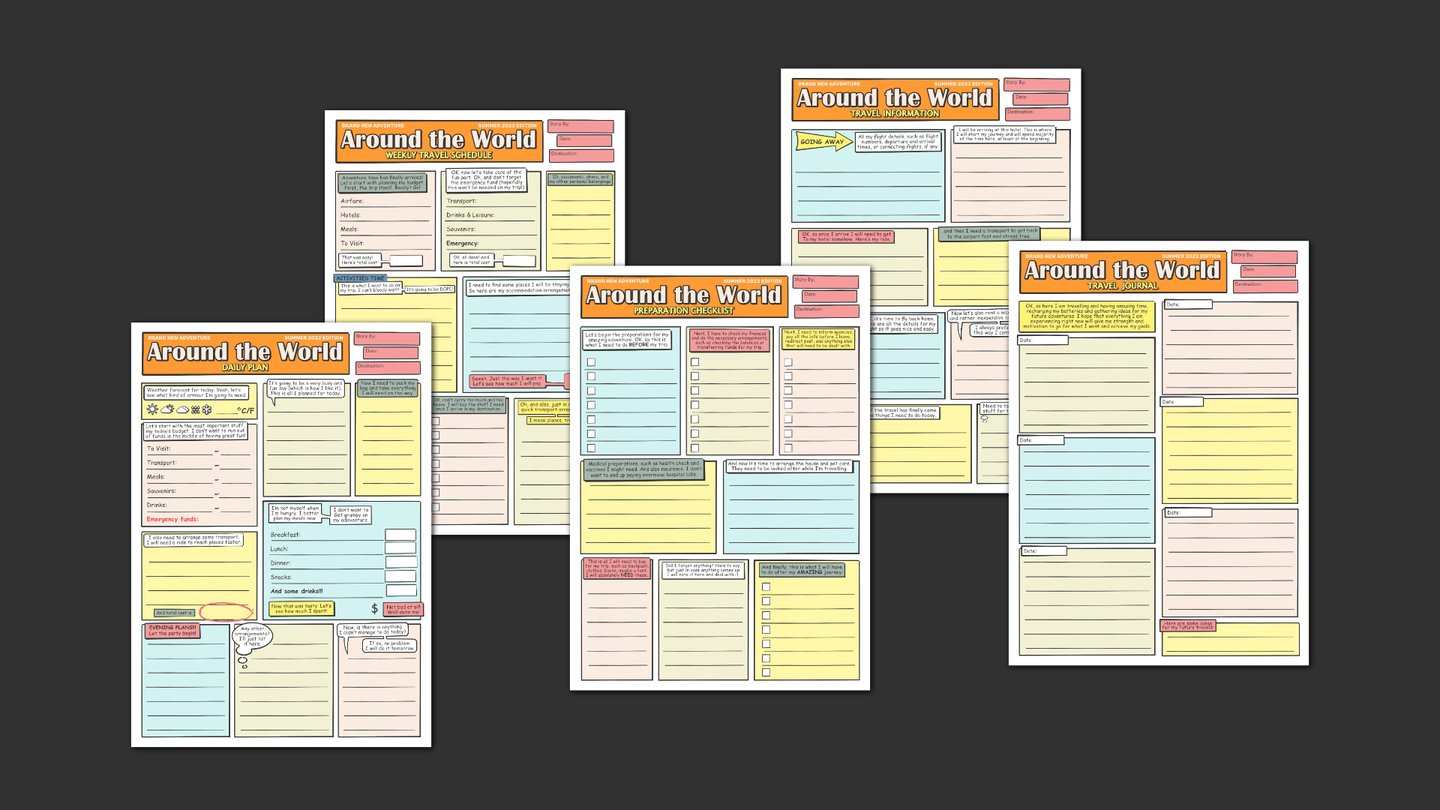 Each planner features a daily and weekly planner, a preparation checklist, a travel journal, and essential travel information, all nestled within its own unique layout. These planners come with distinct titles and header sections, reflecting different themes that resonate with adventurers.